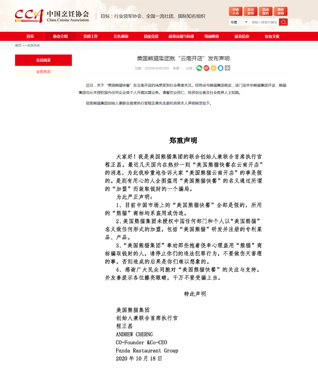 同时中国烹饪协会,受熊猫集团创始人兼联合首席执行官程正昌先生委托将其本人声明进行了转发。