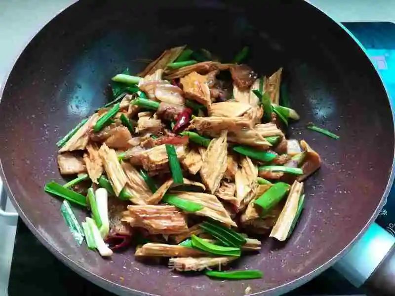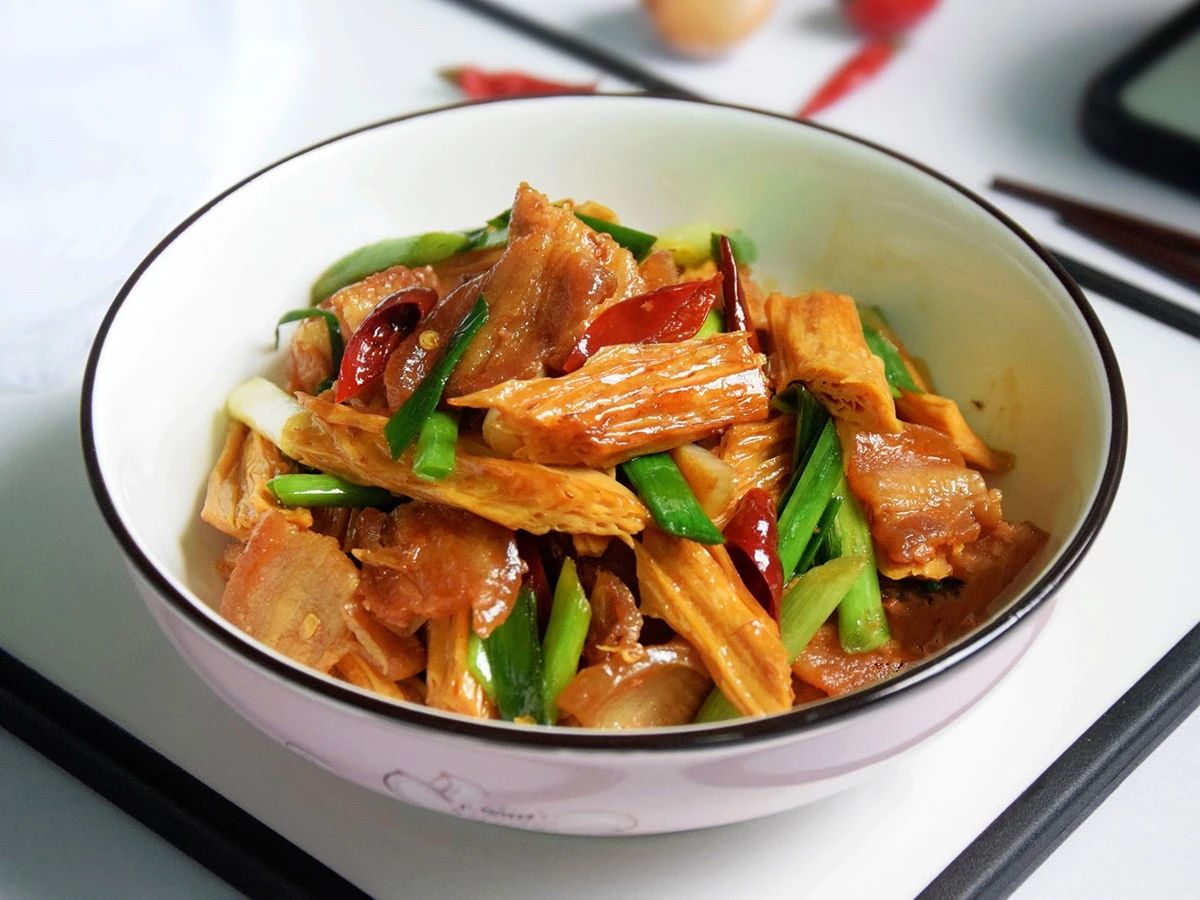 五花肉200克腐竹75克蒜苗5棵蒜2瓣干辣椒5只姜2片大葱1段酱油2汤匙蚝油1汤匙油适量