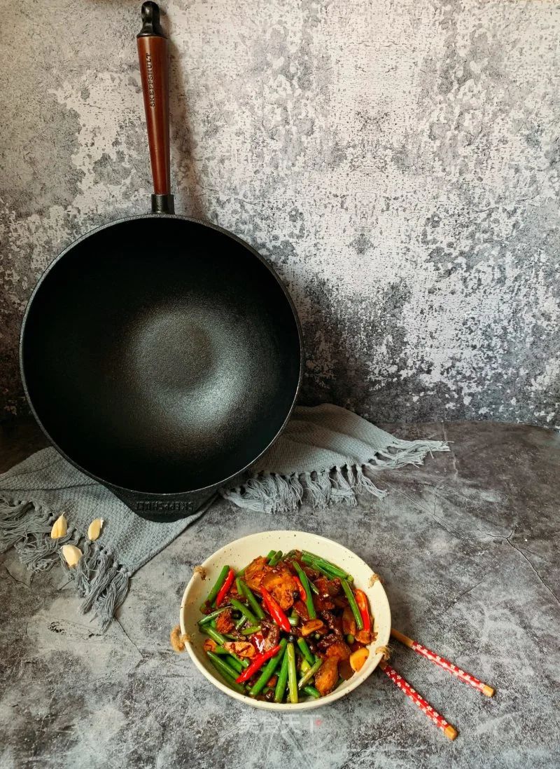 10. 收汁后加入蒜苗炒断生就可以了。● ● ●