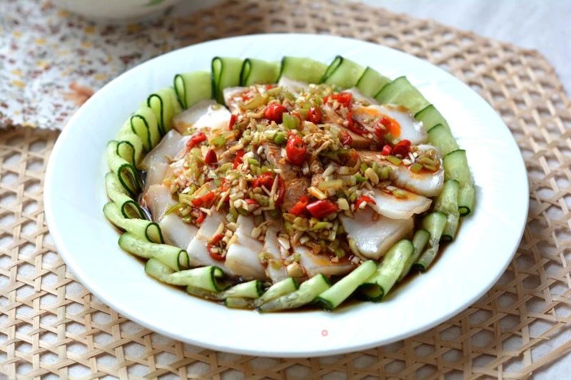 10. 浇在白肉黄瓜片上,最后淋辣椒油,开吃吧。小窍门: 1、白肉煮时可以无需太多调料,少许料酒、八角足矣,凉吃没有腥味。 2、黄瓜刮成片不但摆盘漂亮,口感也比切条切块更加脆嫩。 3、料汁随喜好来调整。