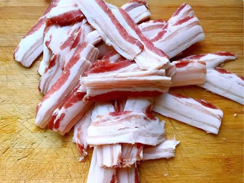 2. 辣椒、蒜苔切小段,大蒜切片、五花肉切成薄片。