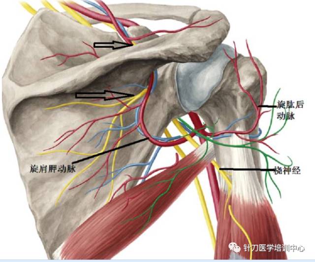 1、肩胛上孔(黑箭头)由肩胛切迹和肩胛上横韧带围成 ,其体表投影在肩胛冈中外 1/3 交点上1cm处, 距皮肤深4.5 cm。 2、肩胛下孔(黑箭头)由冈盂切迹和连于肩峰根部及肩胛骨背面的肩胛下横韧带围成,其体表投影位于肩胛冈中外 1/3 交界处下方 2 cm 处的深面, 距体表3.93 cm。 损伤后临床表现